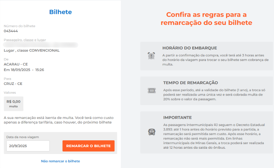 - A remarcação após o horário da viagem está sujeita à cobrança de multa de 20%, além de possíveis diferenças de tarifa caso o novo bilhete tenha um valor maior